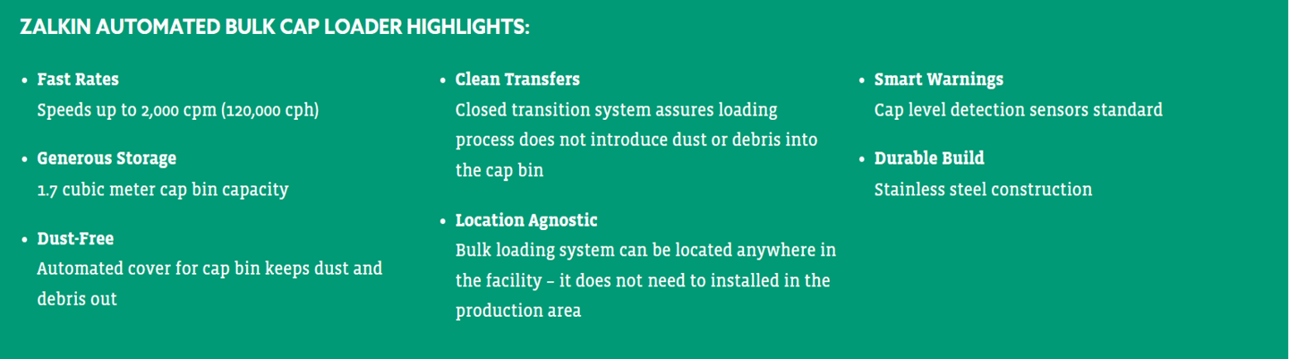 Zalkin application engineers work closely with customers to design and configure the automated bulk cap loading system that is ideally suited to each application and production environment. When supplied as part of a Zalkin capping system, Zalkin automated bulk cap feeders offer unmatched performance because they are designed and configured to work seamlessly with other system components.