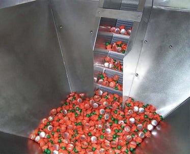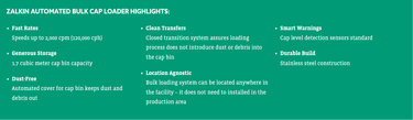 Zalkin automated bulk cap loading systems free-up operators to focus on machine operation and line performance by automating the loading of caps into feeder bins. Automated bulk loading systems dump full pallet totes of caps, also referred to as Octabins, into bulk feeder bins. Full pallet totes are staged by fork lift drivers, and from there, the loading process is automated. Each full pallet tote of caps replaces approximately 1 pallet of traditionally boxed caps that must be opened and dumped by operators into feeder bins. This can save up to 10 minutes of operator time per hour. Over the course of a year, time savings will easily exceed 600 hours. From the bulk loading system, non-oriented caps are transported via Zalkin cap conveying systems to secondary cap feeding components or directly to cap orienters. A truly automated, labor saving solution.